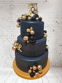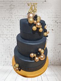 Vendo torta scenografia in gomma eva nera e nera glitterata con sfere nere e oro e base oro glitter. lettera iniziale e scritta topper sostituibili.