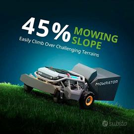 Pendenza max di taglio 45°, larghezza di taglio 55 cm, possiede aspiratore di erba e foglie, con scarico automatico della raccolta. Autonomia fino a 3000mq per ricarica.u