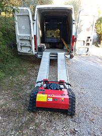 Velocità di lavoro: 0–3 km/h ; Distanza massima telecomando dichiarata: 680 m ; Dimensioni: Larghezza macchina: 98 cm Lunghezza: 115 cm Altezza: 52 cm Peso: 140 kg Larghezza di taglio: 550 mm ; Extra incluso: Coltello da lancio tipo “S” in dotazione, utile come ricambio. Macchina ideale per uliveti, vigneti, scarpate e terreni difficili. Video dimostrativo disponibile su richiesta.