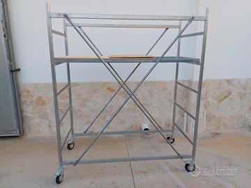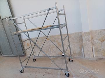 Trabattello realizzato in acciaio zincato a caldo con tubolare da 35 millimetri, con un ingombro di 1,60mx0,75m e 1 85 m di altezza, che permette di lavorare ad un altezza di 3,5 metri in sicurezza.