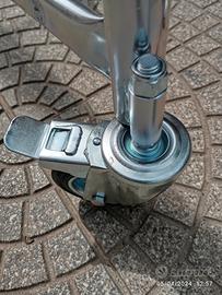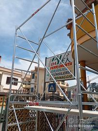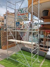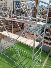 trabattello acciaio composto da una base 75x165 con quattro ruote piroettanti e frenanti due piani di lavoro in multistrato no botola due alzate da 1.7 MT con accessori trabattello indicato per lavori interni montato a 2.00 mt e per lavori esterni montato a 3.6 MT