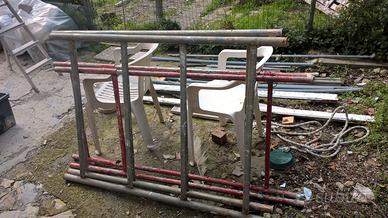 regalo trabattello (senza ruote) adattato nel senso che avevamo questi 4 pezzi che vedete in foto e li abbiamo fissati con del fil di ferro molto spesso e dei "blocchi" fatti con pezzetti di legno, mail tutto si può anche saldare... e sopra abbiamo messo una tavola fissata anch'essa. Certo non è un trabattello professionale ma fissato bene lo abbiamo usato in sicurezza.