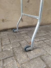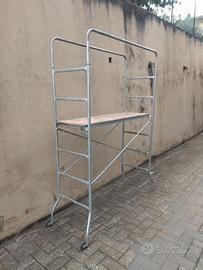 -Vendo trabattello usato. Lo stato di conservazione generale è buono,sono disponibili n' 2 ruote x facilitare lo spostamento. Il trabattello ha n' 6 possibilità di posizionare la pedana. Con la posizione più bassa siamo a 40cm da terra,con quello più alto 1,90mt da terra. In tot è H 2,20mt. Alla base le misure sono: 1,80x 63cm. Il ripiano misura: 1,52 x 44cm. Prezzo: 140€ trattabili.