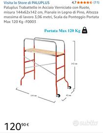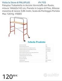 Trabattello completamente smontabile con pedana in legno multistrato con appositi incastri per regolare l'altezza di lavoro, pratiche rotelle per favorire lo spostamento con gommini per non graffiare a terra. Comprato per ristrutturazione propria abitazione quindi usato solo per questo. Vendo per fine lavori a un prezzo affare.non spedisco solo ritiro a mano Per info non esitate a contattare. Tel 3298137206