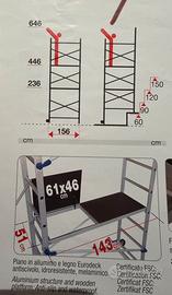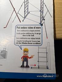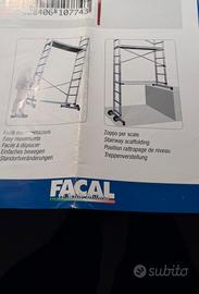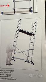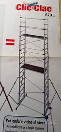 Trabattello Clic-Clac in alluminio smontabile e componibile. Trabattello in elementi di alluminio facilmente smontabile e montabile per lavori fino a 6,70 mt dal suolo. Il trabattello è in buono stato d’uso può presentare qualche piccola macchia di vernice. così composto: Quattro spalle di allumini0 a 6 gradini (gradini 30x30 mm e montanti da 24x60 mm) Due spalle di alluminio a 7 gradini Sei barre diagonali e 8 barre orizzontali con sistema di aggancio ultrarapido. Quattro barre stabilizzatrici telescopiche Due barre di sostegno a pavimento con ruote per facili spostamenti, Due pedane in alluminio e legno Eurodeck con botola apribile e con forti ganci di ancoraggio. misure 143x51, botola 61x46. Supporto per montare carrucola per portare attrezzi in quota. Portata massima 150 Kg Può essere posizionato rasente il muro oppure zoppo appoggiato su gradini di una scala, o muretto. Due persone lo montano in un dieci minuti. Corredato di istruzioni di montaggio.