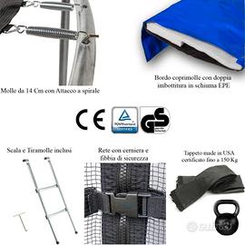 DIFFIDATE DA CHI VENDE TRAMPOLINI CON IL TAPPETO CHE SUPPORTA MASSIMO 60/80 KG, SONO TAPPETI DI BASSA QUALITA' CHE SI DANNEGGIANO DOPO I PRIMI SALTI! SOLO NOI FORNIAMO IL TAPPETO IN POLIPROPINELE PP-MESH PRODOTTO IN USA CHE SUPPORTA FINO A 150 KG!!!