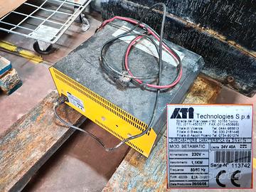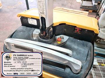transpallet elettrico con pedana Cat usato, si tratta di un carrello elevatore uomo a bordo di marca Cat mod. NPV20N del 2008 completo di batteria di marca Technologies S.p.a mod. Betamatic funzionante a 24v.