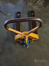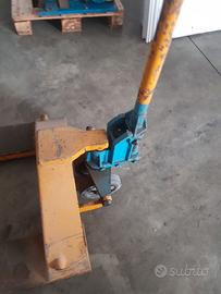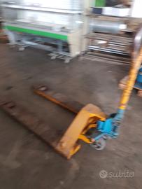 Transpallet con forche maggiorate usato, si tratta di un transpallet idraulico fuori standard per bins, adatto al sollevamento e spostamento di cassoni. Dimensioni: cm 157x75x121h, forca cm 114x18x8h, spazio forche 39cm € 250