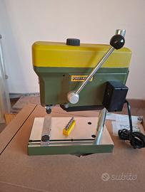 Il trapano da banco PROXXON TBM 220 è indicato per lavori di alta precisione poiché la sua elevata concentricità e le vibrazioni estremamente ridotte permettono di effettuare con precisione anche fori di ½ cm; ideale fra l’altro per la foratura di circuiti stampati. E’ dotato di trasmissione a cinghia a tre velocità (regolabile tramite lo spostamento della cinghia) che permette di mantenere una coppia altissima anche a bassi giri della punta. Il piano di lavoro rettificato è in alluminio pressofuso ed è munito di una guida parallela, una scala graduata e un sistema di regolazione della profondità (tramite una vite di arresto registrabile); dispone inoltre di fori filettati che consentono il fissaggio del micro tavolo a croce KT 70 acquistabile come accessorio opzionale. Questo trapano ha una solidissima colonna in acciaio pieno e un resistente braccio in pressofusione d’alluminio provvisto di guide e sedi rettificate. Il suo motore da 85 W testato VDE è molto longevo e silenzioso. Il trapano dispone di una filettatura esterna da 3/8’’ che consente l’avvitamento di un mandrino a cremagliera ed è fornito completo di 6 pinze di serraggio in acciaio a 3 segmenti di varie dimensioni. Piano di lavoro in alluminio pressofuso (220 x 120 mm) con la rete fissa regolabile e scalare così come fori filettati per il fissaggio del tavolo a croce KT 70. MICRO colonna in acciaio solido (20 x 340 millimetri). Recinzione regolabile con scala. Colonna in acciaio cromato duro solido, alto, diametro 340 millimetri 20 mm. Dati tecnici: 230. 85W. 50 - 60Hz. Velocità del mandrino di 1.800, 4.700 e 8.500 rpm. Estremamente elevata precisione di rotazione, alimentazione 30 mm. Profondità della gola 140 millimetri. Sei triple pinze fessura di precisione per l'albero grandezza da 1 - 1,5 - 2 - 2,4 - 3 - 3,2 millimetri sono inclusi. Peso 3,3 kg.