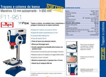 Trapano a colonna Fox Femi F11-951 motore 350W - altezza 720 mm - puntatore Laser integrato. Nuovo mai usato!
