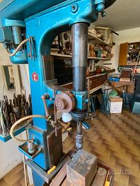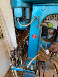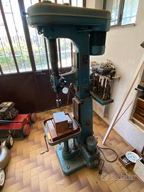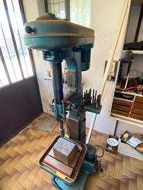Vendo trapano a colonna marca H.B.O. M), interamente in ghisa verniciata blu. Costruzione robusta e massiccia. Alimentazione 220V Piano di lavoro regolabile in altezza, più velocità selezionabili tramite cinghia. Targhetta originale presente e leggibile.