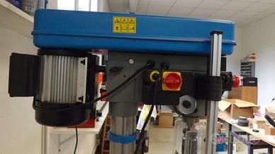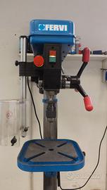 Trapano a colonna Fervi trasmissione a cinghia, tavola girevole ed inclinabile. Adatto per lavorazioni di foratura, alesatura e lamatura, motore monofase da 0,75 kW.