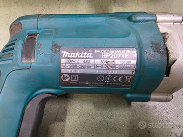 Trapano a percussione Makita modello HP2071F usato e funzionante. Utensile professionale a filo da 1010 W, adatto sia come trapano tradizionale sia come trapano a percussione per muratura. Completo di impugnatura laterale, asta di profondità e valigetta originale in metallo. Alimentazione 230 V. Presenti normali segni di utilizzo visibili dalle foto ma meccanicamente in buono stato. Ideale per lavori edili e di manutenzione.