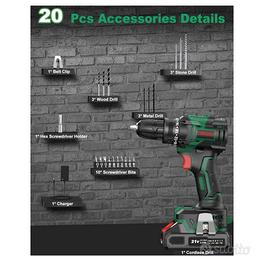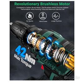 Trapano avvitatore Brushless 21V, Batteria da 2.0Ah, 42 N.m Avvitatore Elettrico, 2 Velocità, 18+1 Coppia, 22 Accessori, luce led Nuovo in scatola originale