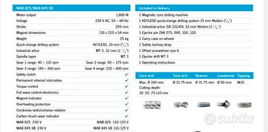 Vendisi per inutilizzo trapano magnetico/carotatrice professionale marca BDS modello MAB 845 SB per uso industriale. Dotato di magnete auto generative, permette di ancoraggi stabili su ogni superficie magnetica o su banco da lavoro magnetico. Oggetto realizzato in Germania con doti di grande robustezza e potenza. Ideale per impieghi gravosi di foratura, fresatura profonda, maschiatura, etc. Riporto caratterisriche come da scheda tecnica: Motor output 1,800 W Voitage 230 V AC, 50-60 Hz Stroke 255 mm Magnet dimensions 110 x 220 x54 mm Weight 25 kg Quick-change drilling system KEYLESS, 19 mm (/.") Industrial arbor MT 3, 32 mm (1 /4") Spindle taper MT 3 Gear 1 range: 40-110 rpm Gear 2 range: 65-175 rpm Gear 3 range: 140 -360 rpm Gear 4 range: 220- 600 rpm Safety clutch S Permanent internal lubrication S Torque control S Full wave control electronics Magnet indicator Overheating protection Clockwise/anticlockwise rotation Carbon brush wear indicator S MAB 825 230 V MAB 825 110/125 V MAB 845 SB 230 V MAB 845 SB 110/125 V 1 Magnetic core drilling machine 1 KEYLESS quick-change drilling system 19 mm Weldon (/") 1 Industrial arbor ZIA 332-KN, 32 mm Weldon (1 1/.") 1 Ejector pin ZAK 075, 090, 100, 120 1 Carry case on wheels 1 Safety lashing strap 1 Offset screwdriver size 6 1 Ejector drift MT 3 1 Operating instructions Core drill Twist drill Reamer Countersink Tapping Max. 100 mm 031.75 mm 031.75 mm 050 mm M30 Cutting depth: 30-55-75-110 mm