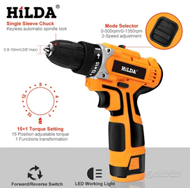 Trapano-avvitatore HILDA 16.8V elettrico con batteria al litio ricaricabile a due velocità, elettrico e senza fili.