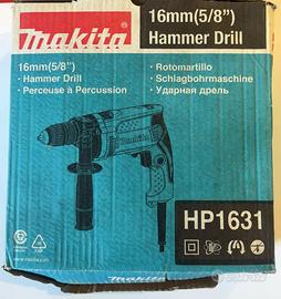 trapano makita art.HP1631 a percussione watt 710 elettronico, mandrino autoserrante d.mm.1,5-13, reversibile, accessori in dotazione: asta di profondità, impugnatura laterale - capacità foro: legno mm.30, acciaio mm.13, calcestruzzo mm.16 - velocità a vuoto giri/min.3200 - colpi al minuto 48000 - peso kg.1,9 ricambi: carboncini cod.MCB419 NEL CASO NECESSITI FATTURA COMUNICARE I DATI AL MOMENTO DELL'ACQUISTO, IN CASO CONTRARIO IL PRODOTTO VERRA' CONSEGNATO CON REGOLARE SCONTRINO