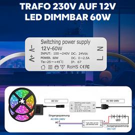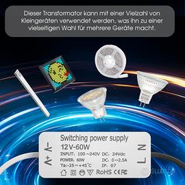 Trasformatore LED 12V 60W 5A, trasformatore 230V a 12V alogeno IP67 impermeabile, trasformatore a bassa tensione AC a DC per interni ed esterni, per faretti LED G4 GU4 GU5.3 Striscia LED, telecamere CCTV