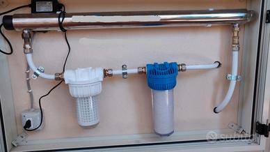 Installiamo sistemi di filtraggio a monte o sottolavello, trattamento dell'acqua con speciali filtri a microfiltrazione e ultrafiltrazione con filtri polipropilene o carbonblock , e con sterilizzatori UV da 6w,30w, 55w, per debatterizzare l'acqua. Per chi ha problemi di acqua sporca contaminata da (escherichia coli) batterio sensibile al calore e alla illuminazione ultravioletta, e molti altri tipi di batteri e virus che possono contaminare l'acqua, acqua da pozzo, acqua piovana ecc. Per abitazioni , residence, alberghi . Impianto sottolavello a partire da 439€ ,Per l'acqua di pozzo effettuare l'analisi in un laboratorio, per contatti o messaggio whatsapp o sito stesso.