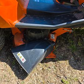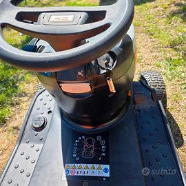 Trattorino rasaerba compatto con scarico laterale, ideale per prati fino a 6000 m². Comprato a Maggio 2023 e usato pochissimo per cambio a trattore agricolo. Compreso il carrello in foto. Dati Tecnici Cilindrata452 cm³ CO2773 g/kWh Tipo motoreEVC 4000.1 Peso197 kg Max. Superficie del pratofino a 6000 m² Larghezza di taglio95 cm Altezza di taglio35 - 90 mm Capacità serbatoio9 l Regime nominale3100 U/min Raggio di sterzata0,8 m Lunghezza utensile senza cesto di raccolta187 Larghezza attrezzo con meccanismo di taglio116 cm Altezza attrezzo fino al sedile115 cm Livello di potenza acustica garantito LWA100 dB(A) Livello di pressione acustica misurato LpA85 dB(A) Fattore di incertezza livello di pressione acustica KpA2 dB(A) Valore vibratorio al sedile0,5 m/s² Incertezza vibrazione al sedile0,25 m/s² Valore vibratorio al volante2,8 m/s² Incertezza vibrazione al volante1,4 m/s²