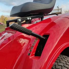 Motore benzina da 11 CV, trazione idrostatica, piatto tagliaerba da 92cm e regolabile in 7 posizioni di altezza, sacco di raccolta, taglio anche in retromarcia.