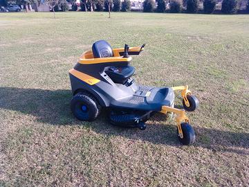 Alimentazione a batteria 🔋 da 64 Ah con autonomia di taglio fino a 8000 m², circa 110 minuti di lavoro con una sola carica.Piatto di taglio bilama 108 cm (kit mulching optional)