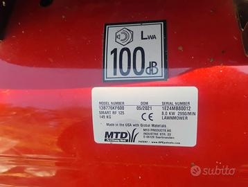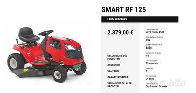 Vendo trattorino tagliaerba MTD smart rf 125, con carrello ribaltabile, usato pochissimo. Larghezza di taglio 92 cm, cilindrata 382. Motore benzina 4 tempi.