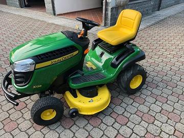 Trattorino taglierba John Deere X126, anno 2020, solo 35 ore di lavoro, perfetto, come nuovo, idrostatico, scarico laterale o mulching, motore Briggs & Stratton, 500cc., 15 cv, con in dotazione altre 4 gomme tractor, oltre le sue intonse , bull bar anteriore, doppie chiavi e libretto uso e manutenzione. Prezzo leggermente trattabile. Solo ritiro. Giulio