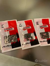 Tre catene 6" nuove mai utilizzate. Imballate nel loro pack. Soltanto un pack è stato aperto per provare la catena che però non è mai stata utilizzata. Non era delle dimensioni corrette x poter essere utilizzata con la mia mini motosega.