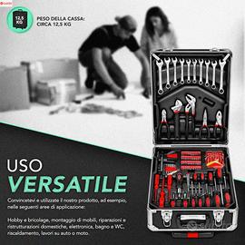 Informazioni su questo articolo La valigia universale degli attrezzi per principianti utilizzata come attrezzatura di base comprende 949 elementi ed é adatta per i seguenti campi di utilizzo: hobby e fai da te, montaggio di mobili, riparazioni e ristrutturazioni in casa, elettronica, sanitari, impianti di riscaldamento, riparazioni di automobili o motocicli. quattro scomparti removibili per offrire una migliore organizzazione e visibilitaà dei diversi attrezzi. Una completa lista degli attrezzi é disponibile sotto la descrizione. Perfetta per portarla sempre con se e per riporla nel portabagagli: leggera, realizzata in alluminio, manico telescopico estraibile, ruote per facilitare il trasporto. Dimensione: 51,0 x 36,5 x 20,5 cm