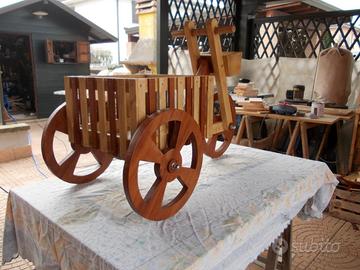 di nuovo realizzo, vendo triciclo portafiori in legno bicolore, misura cm.115x77x54h. cestello cm 45x43 circa