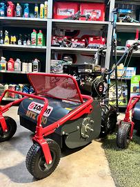 Trinciaerba compatta e maneggevole, ideale per lavori in spazi ristretti, rotore con sistema di taglio elicoidale, coltelli in acciaio, trasmissione a cinghie, manubrio regolabile.