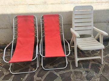 Set da tre pezzi di sdraio da giardino, prendisole, due in tela e metallo ed una in plastica