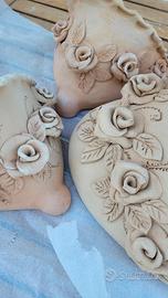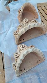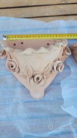 Elegante trittico di vasi o tasche da parete o muro, in terracotta toscana, finemente decorate a mano con motivi floreali. Le misure e le condizioni esemplari sono visibili dalle foto. Acquistati molti anni fa ma mai utilizzate.