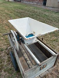 L’attrezzo è dotato di tramoggia in metallo verniciato, rulli e manovella laterale per la frantumazione dell’uva, ideale per la vinificazione tradizionale.