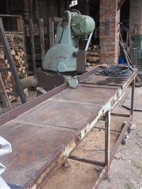 Troncatrice basculante provvista di banco 4 mt., per intestare tavolame su misura, adatta a lavorazione di semilavorati in serie di segheria o falegnameria, dotata di lama circolare D. 30 cm. (solo la lama nuova costa 200 euro).