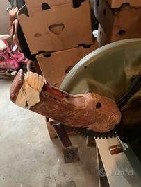 La sega è inclinabile. Alimentazione 220 volt. Come si vede dalla foto, la manopola dove è posizionato l’interruttore è crepata ma non compromette il funzionamento. Visto il peso è indispensabile il ritiro sul posto