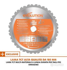 La troncatrice scorrevole multi-materiale 185 mm Evolution R185SMS+, grazie alla lama TCT a 20 denti e all'annesso sistema ottimizzato di cambio velocità, è può di effettuare tagli su una grande varietà di materiali tra i quali acciaio dolce, alluminio, legno con chiodi, plastica, rame e molto altro. Taglia l'acciaio dolce senza produrre surriscaldamento, ronzii e praticamente alcuna scintilla, restituendo tagli pronti alla saldatura. Perfetta ed efficace per l'uso in cantiere. Una troncatrice multi-materiale estremamente versatile. Il modello R185SMS+ è l'ideale per tagliare tubi di rame e di plastica, condotti di alluminio, canaline per cavi, battiscopa, architravi, MDF, legni massicci come quercia e frassino e molto altro. Un attrezzo davvero impareggiabile per lavori in ambito domestico o professionali, capace di lavorare con facilità su legno di recupero, attraversando anche chiodi, viti e punti metallici. Evolution R185SMS+ è fornita con lama multi-materiale R185-TCT (20 denti), con diametro 185 mm e diametro foro 20 mm.