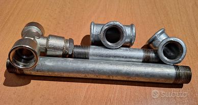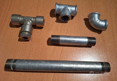 Tubi e raccordi in ferro acciaio zincato dimensione 1/2 filettati come da foto. Nuovi, utilizzati solamente come elemento decorativo. I pezzi sono tutti quelli presenti in foto.
