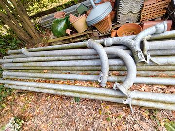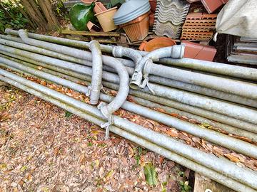 Vendo N. 28 Tubi zincati da 5 metri l'uno diametro un 80 Un giunto dritto da 2,5Mt Una corva ad esse da 2,5Mt Una curva Una doppia deviazione Tre tappi chiusura lunghi Cinque tappi chiusura corti Due treppiedi Due getti Una sorbola. Solo ritiro in loco,non spedisco o consegno a domicilio.