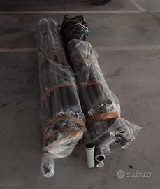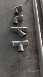 Tubi in pvc rigidi a bicchiere collegabili. Ogni tubo ha lunghezza 2m, diametro 50mm (disponibili 90m di tubi). Raccordi diverse tipologie: curve (16 pezzi), T (16 pezzi) e obliqui (8 pezzi). Il tutto vendibile anche parzialmente. (Prezzo al metro 3,50€; raccordi 1,50€ al pezzo)