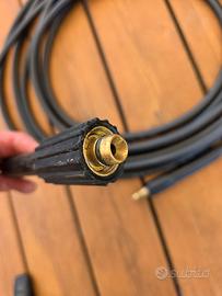 Tubo alta pressione con innesto ad avvitare lato idropulitrice e baionetta lato lancia, lunghezza mt 7 usato 2 volte praticamente nuovo.