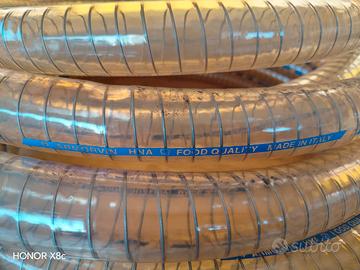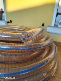 Vendo tubo flessibile in PVC trasparente Armorvin con una spirale di rinforzo in acciaio zincato, progettato per uso alimentare.