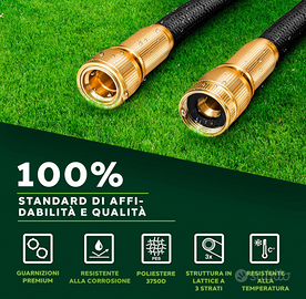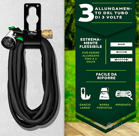 Tubo flessibile rivestito in tessuto di plastica resistente all'abrasione, che può espandere fino a 3 volte la sua lunghezza originale e adatto per pressione fino a 10 bar (normalmente sono 2 – 8 bar). Gli adattatori per il collegamento al rubinetto sono già inclusi per le dimensioni 1 pollici e 3 pollici 4 pollici.