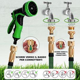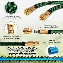 Contenuto della confezione: 1 tubi per irrigazione da giardino da 15 m, 1 pistola da giardino, 1 porta tubo acqua giardino, 2 raccordi in ottone, 3 guarnizioni di ricambio, 1 rotolo di nastro sigillante in teflon, 1 borsa di stoccaggio