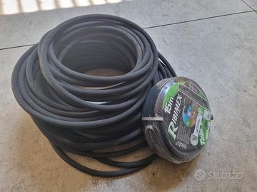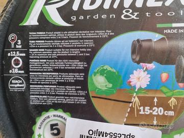 tubo fatto per lasciar passare una piccola quantità di acqua lungo tutta la sua lunghezza, per irrigare uniformemente il terreno di orti e giardini. una confezione nuova da 15m più una da 50 metri aperta e tagliata in tre parti, provata per il mio orto una volta. Preferirei il ritiro o la consegna a mano se siete in zona. Spese di spedizione non incluse, a carico di chi compra, peso 10kg circa