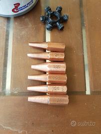 in vendita ugelli per cannello e polvere dissossidante, polvere in barattolo da 100 grammi, nuova, ideale per brasatura con bacchette non rivestite. ugelli per cannello, 2 set da 6 pezzi ognuno, uno in materiale ottone e l'altro in rame, il set di ottone, nuovo comprende 6 misure differenti, SD A 40, SD A 100, SD A 160, SD A 250, SD A 315, SD A 400, il set in rame comprende 4 pezzi da 225, un pezzo marcato 25, e uno senza marcature che a vederlo sembra leggermente più piccolo. solo quello marcato 25 è stato usato, mentre gli altri compresi quelli in ottone nuovi, solo ripuliti dalla leggera patina di ossido, visto che sono alcuni anni che mi girano per il laboratorio, ma per il resto sono a posto. li vendo anche separatamente, 30 a set e 10 la polvere.