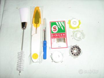 10 Aghi nuovi, 1scovolino, 1 forbicina.5 spoline con fermafilo (una è già montata nella macchina), un taglia asole/filo.