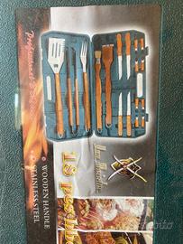 Set barbecue nuovo. Valigetta in plastica contenente 18 accessori con manici di legno. Mai usata, ancora imballata.