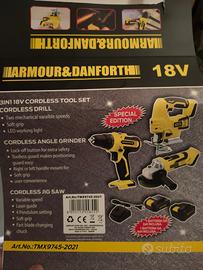 valigetta di plastica rigida con all'interno due ripiani termoforati che ospitano e proteggono trapano avvitatore, seghetto alternativo, smerigliatrice angolare, caricabatterie, 2 batterie ampere + 4 ampere.